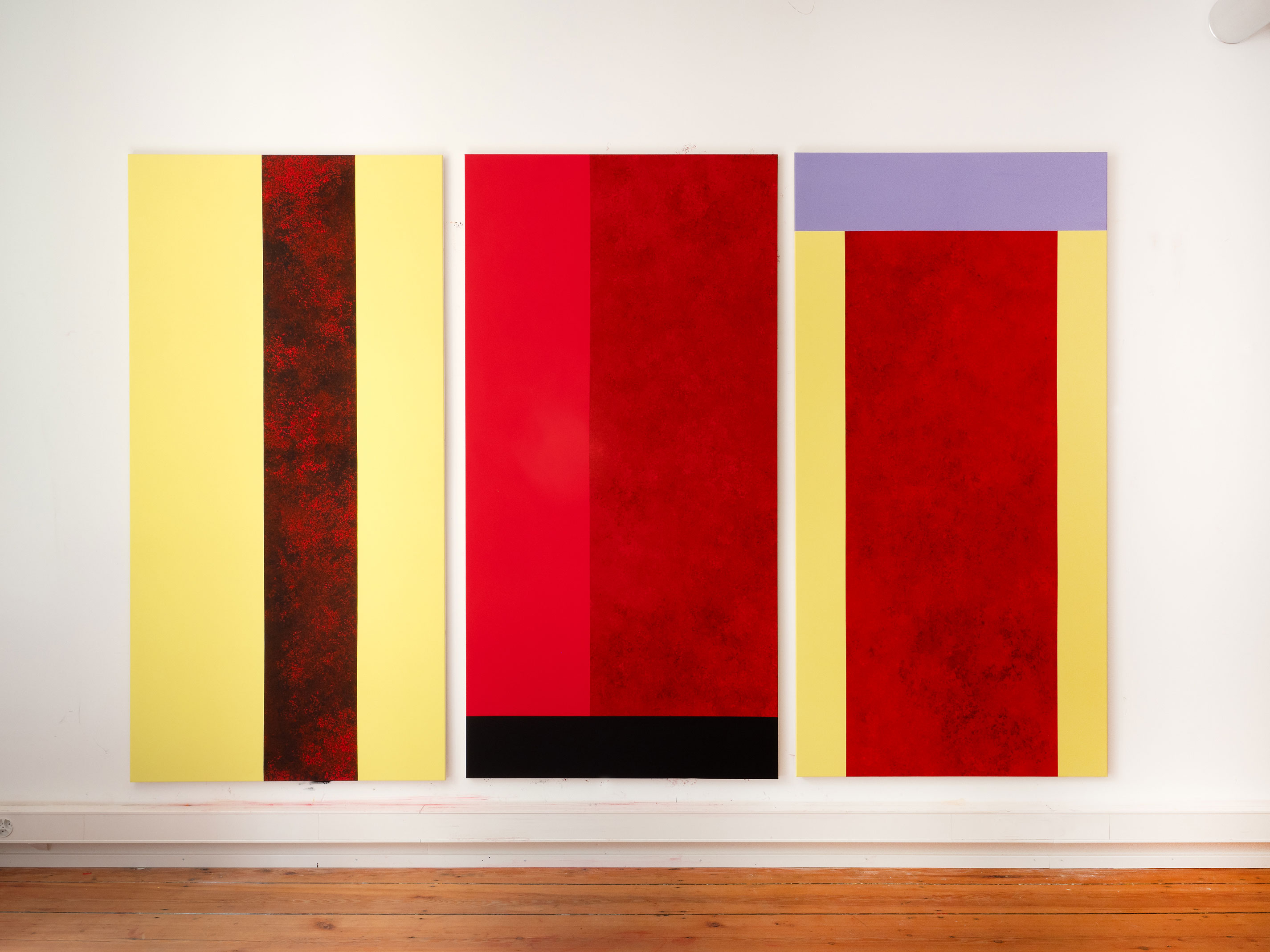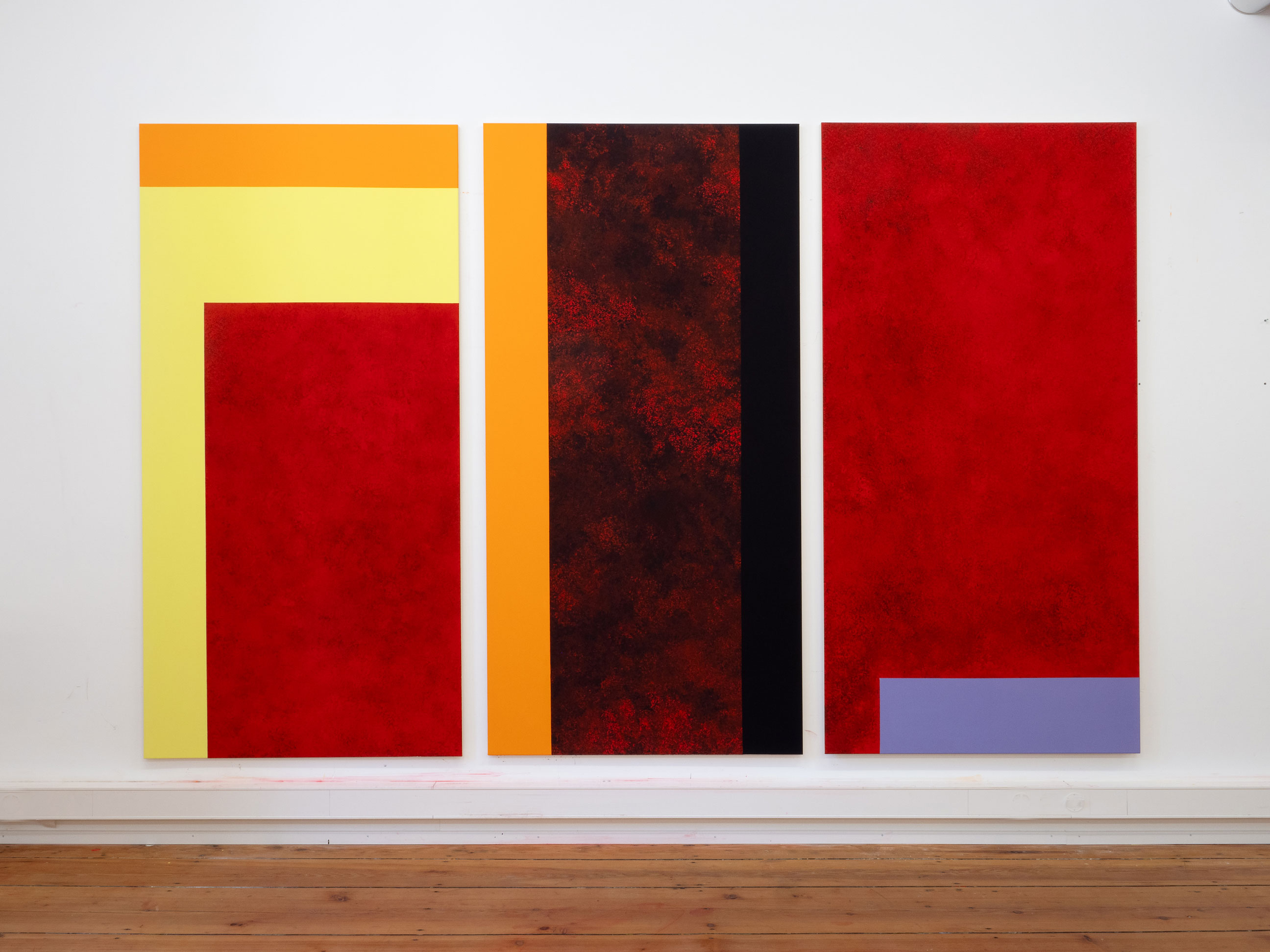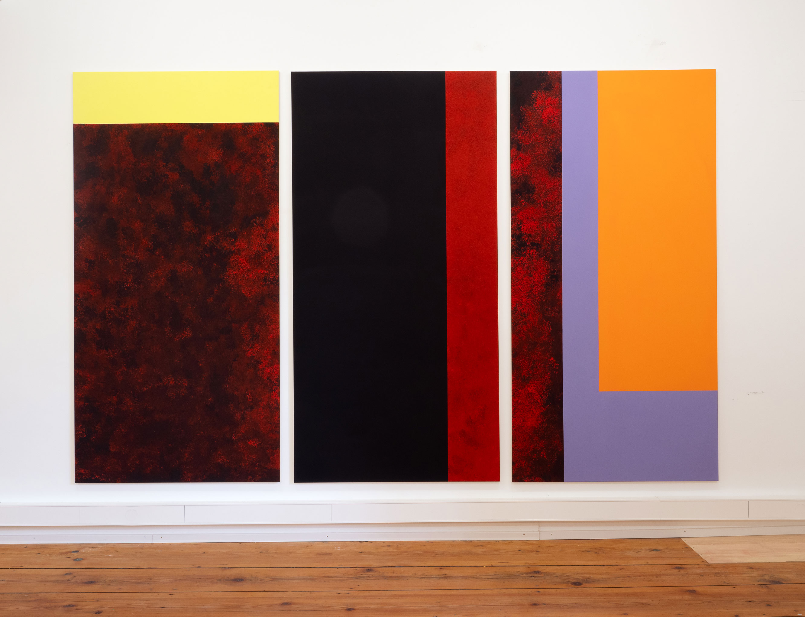 Irgazine Red, Iron Oxide Black, Cadmium Orange, Ultramarine Violet and Nickel-Titanium Yellow on canvas