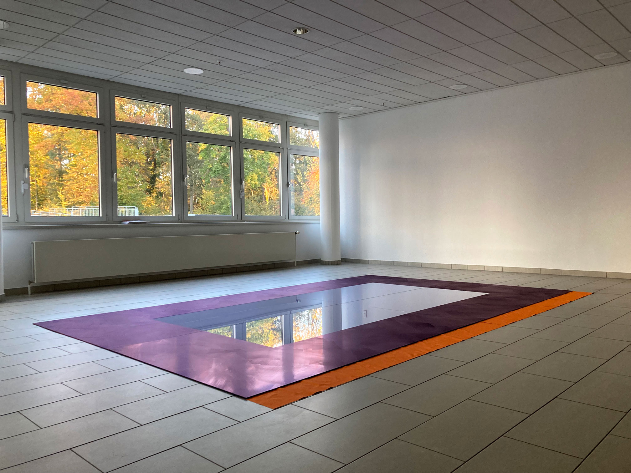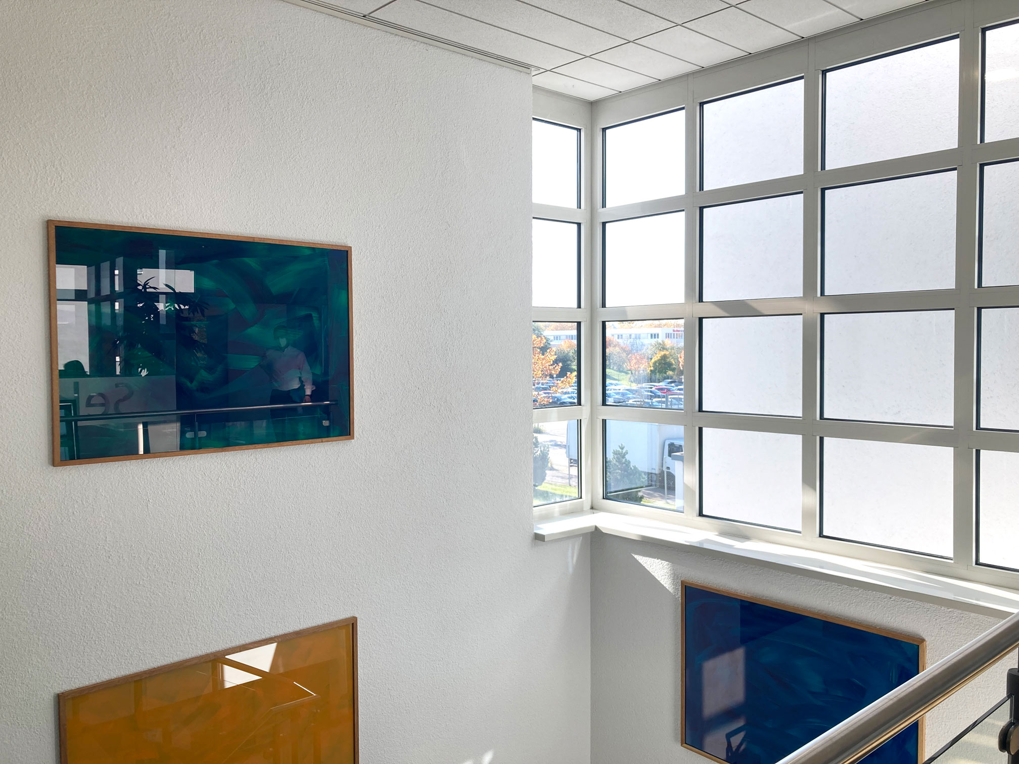 Caput Mortuum, Fluorescent Pigment Green, Paliotol Orange, Ultramarine Violet, Paris Blue and Pastel Green on glass, wood