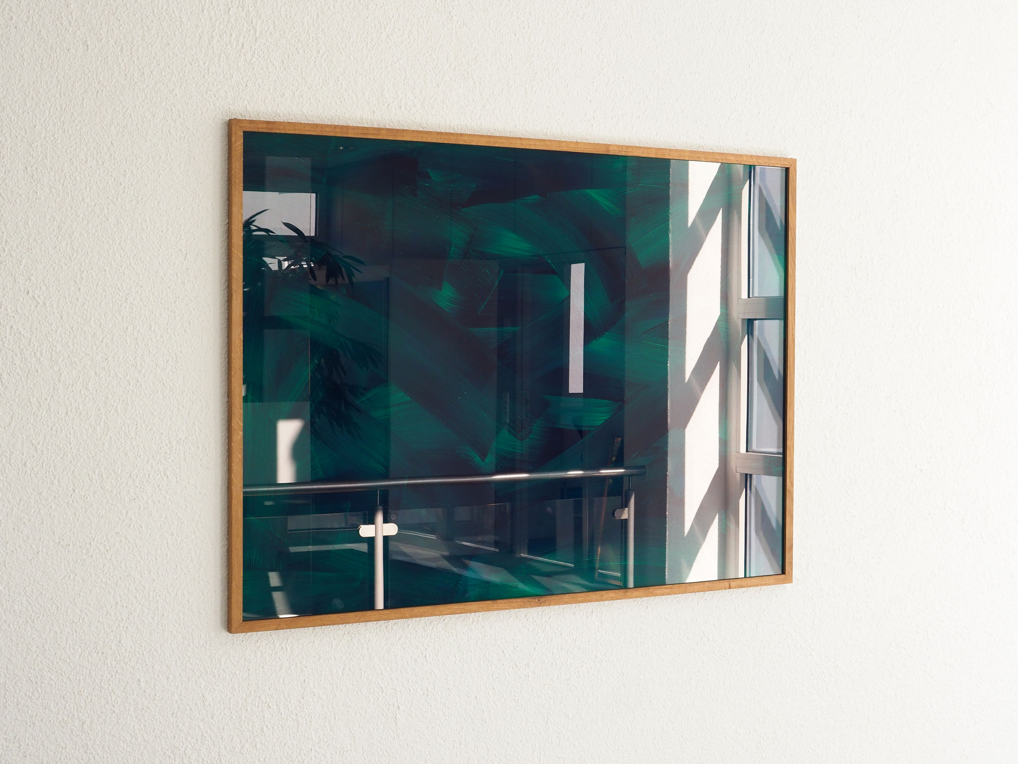 Paris Blue and Fluorescent Pigment Green on glass, wood