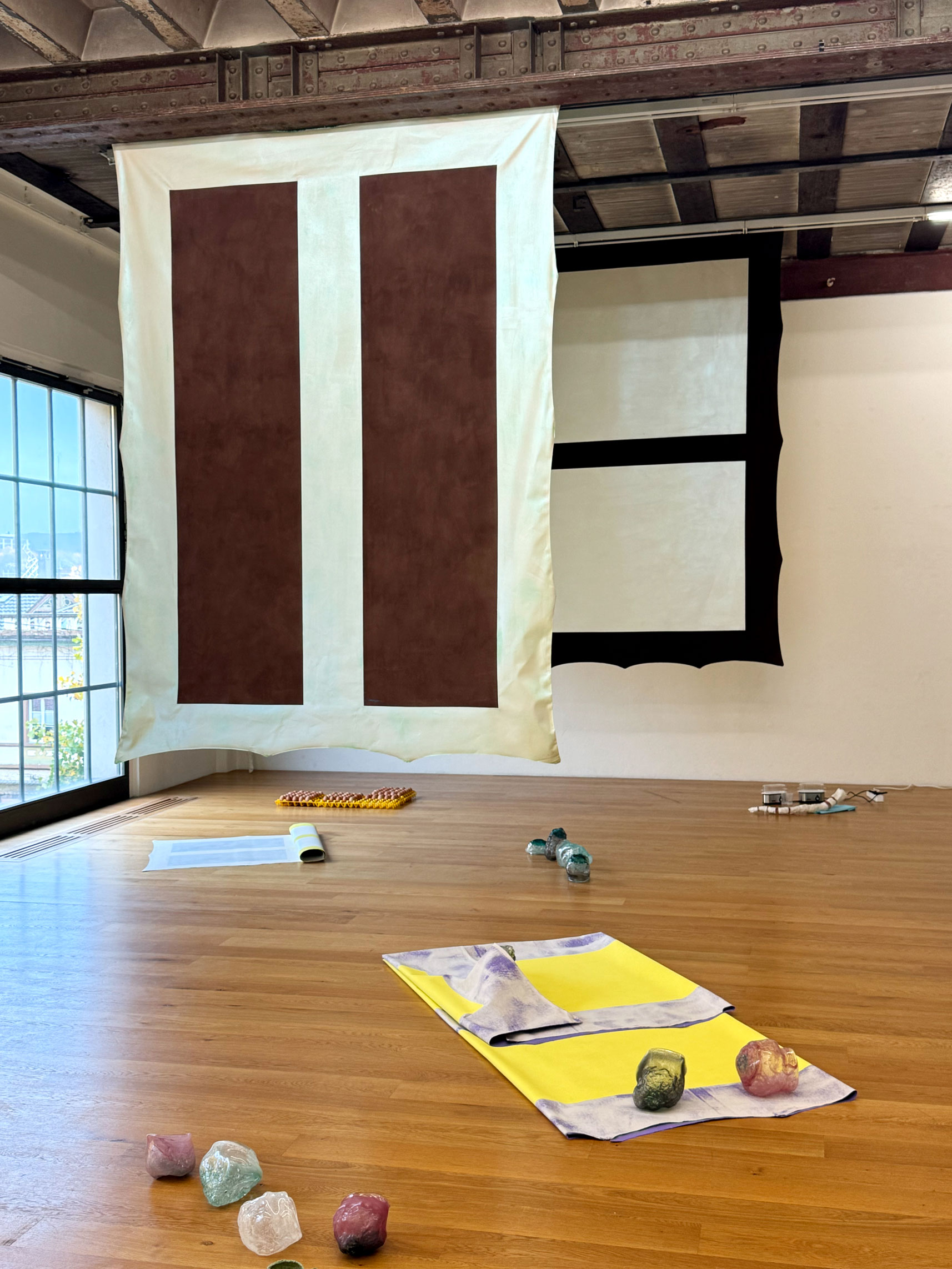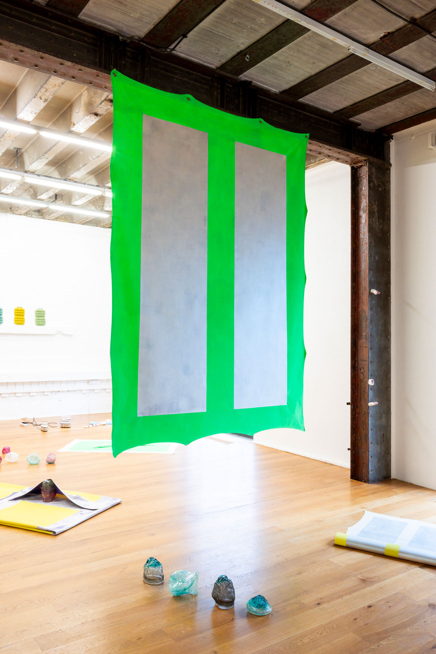 Caput Mortuum, Nickel-Titanium Yellow, Fluorescent Pigment Green, Ultramarine Violet, and Magic Turquoise on canvas